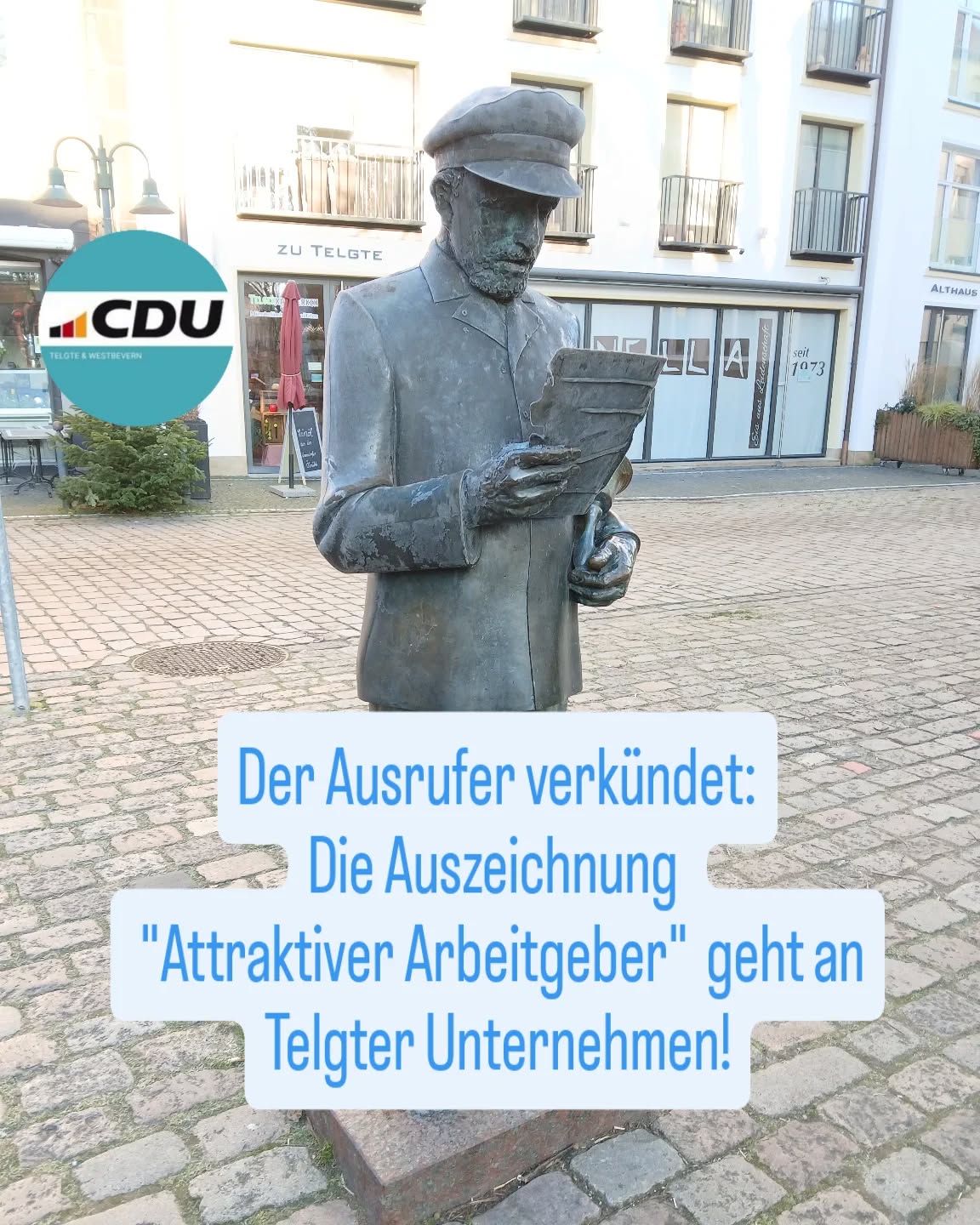 mehrDie CDU steht an der Seite des Ehrenamts. So starten wir bundesweit mit unserem Antrag "Bürokratie runter und Anreize für das Ehrenamt schaffen" eine großangelegte Initiative zur Unterstützung der wertvollen Arbeit der Vereine.Hier in Telgte freuen wir uns auf die Ehrenamtsmesse am 26.01.2024, 11-17 Uhr im Bürgerhaus Telgte. Auf der Messe präsentiert sich das vielfältige Ehrenamt vor Ort, das durch seine Angebote unsere Stadt lebens-und liebenswert macht.#CDUtelgtewestbevern #cdutelgte#Telgte#raestrup #vadrup#ehrenamt